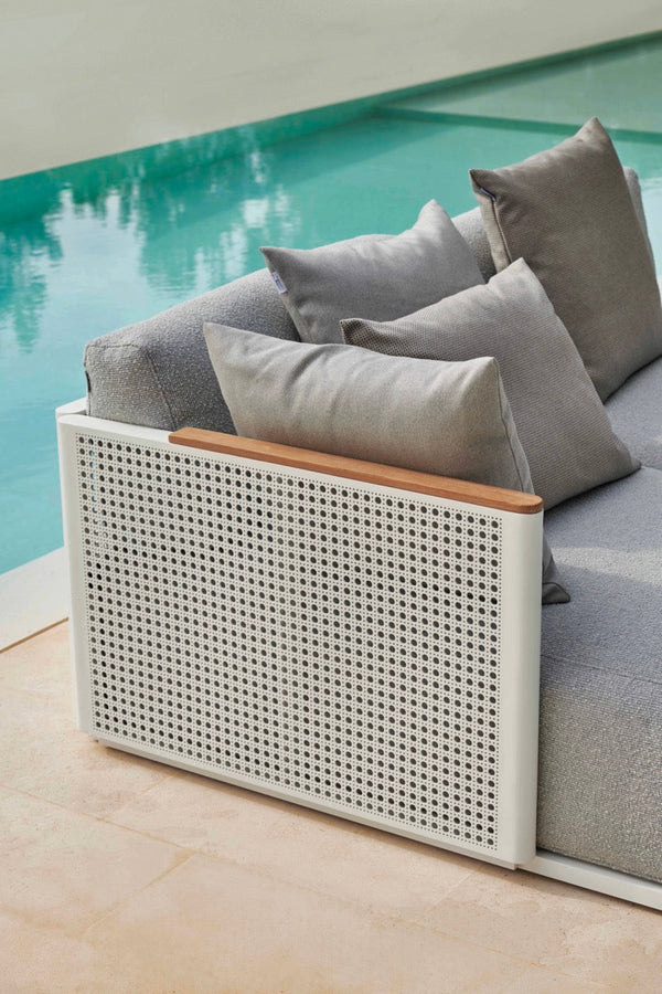 Die Modularität und der Komfort dieser von Made Studio entworfenen Outdoor-Möbelkollektion machen dieses Designersofa zu einem perfekten Verbündeten, um ein Sitzsystem verschiedener Größen je nach den Anforderungen Ihrer Terrasse oder eines größeren Projekts zu konfigurieren.