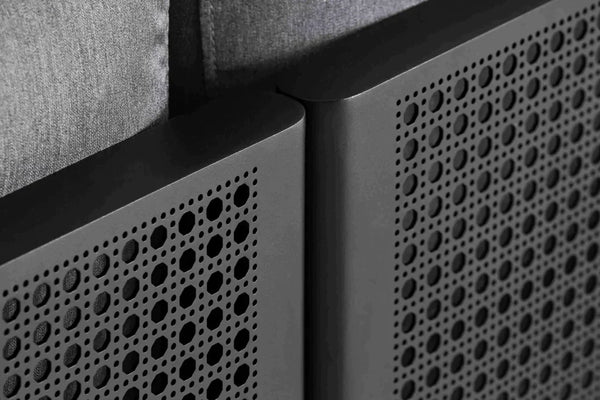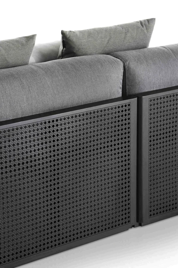 Modular und doch elegant. Das Sofamodul 4 ist ein Designersofa, das aus einem Aluminiumrahmen besteht, der mit einem mikroperforierten Blech verschweißt ist, das durch Lochen gewonnen wird und die Geometrie des für das traditionelle mediterrane Handwerk typischen Rohrs wiederholt. Das Volumen der Kissen bildet den Kontrastpunkt zur Kälte des Aluminiums. Sie vermitteln den Komfort und die Wärme von Innenmöbeln mit Stoffen und speziellen Veredelungen für den Außenbereich in der Qualität von Kvadrat und Dedar Milano.