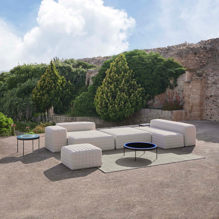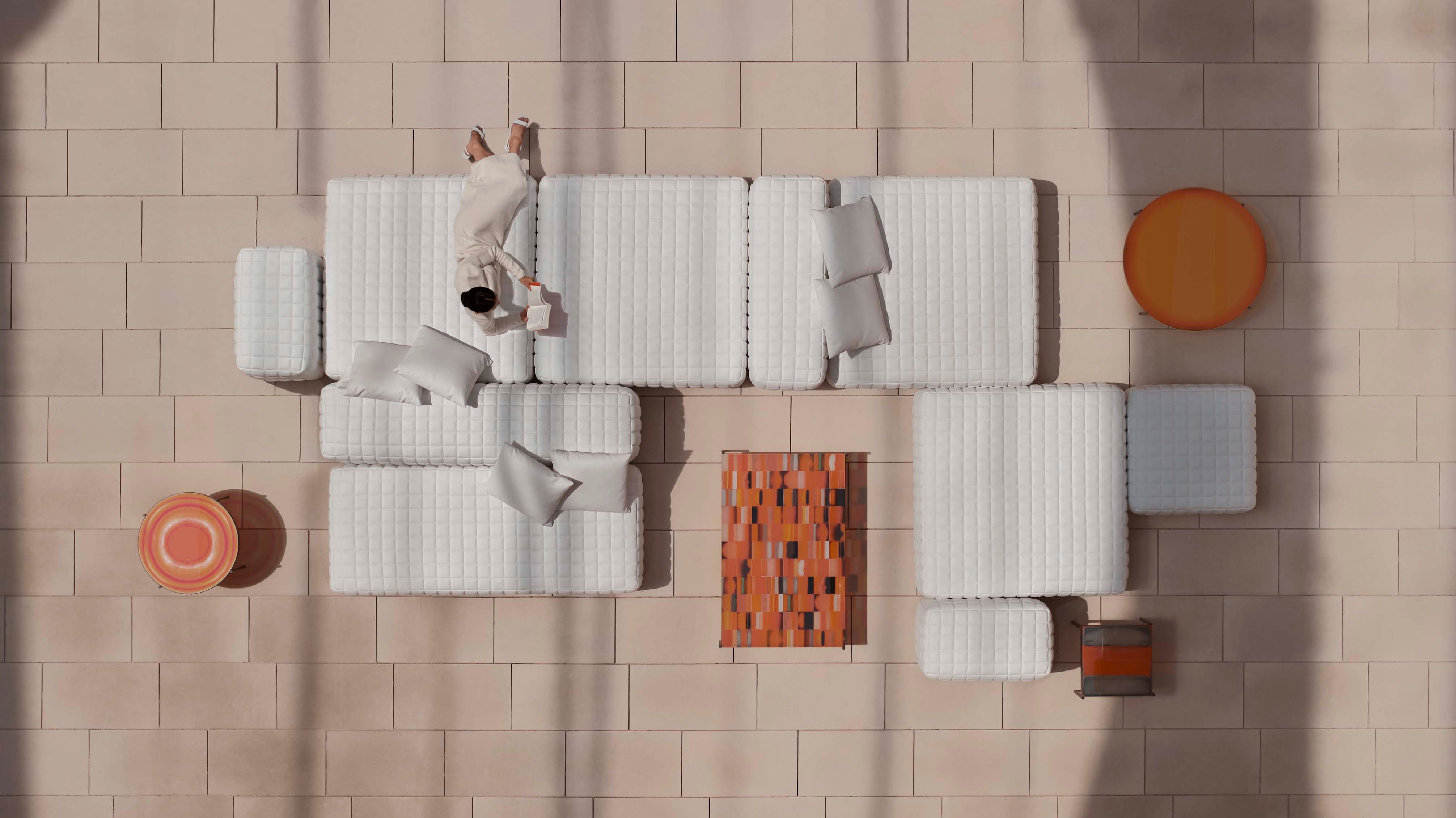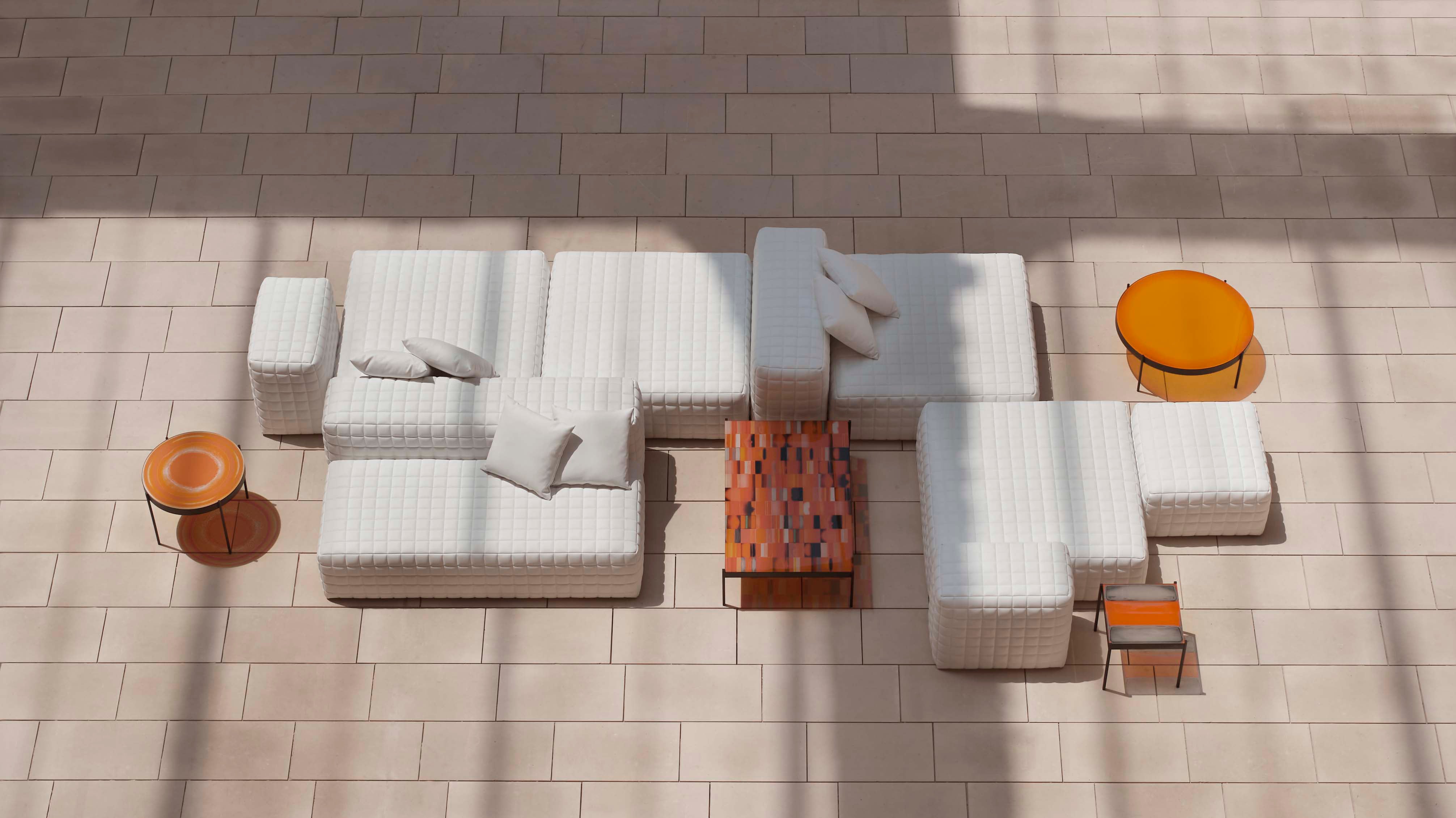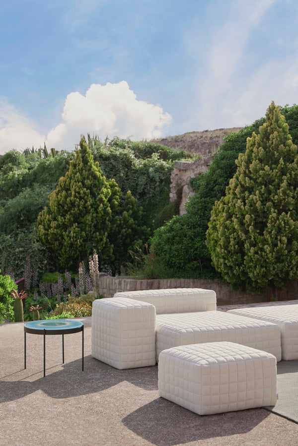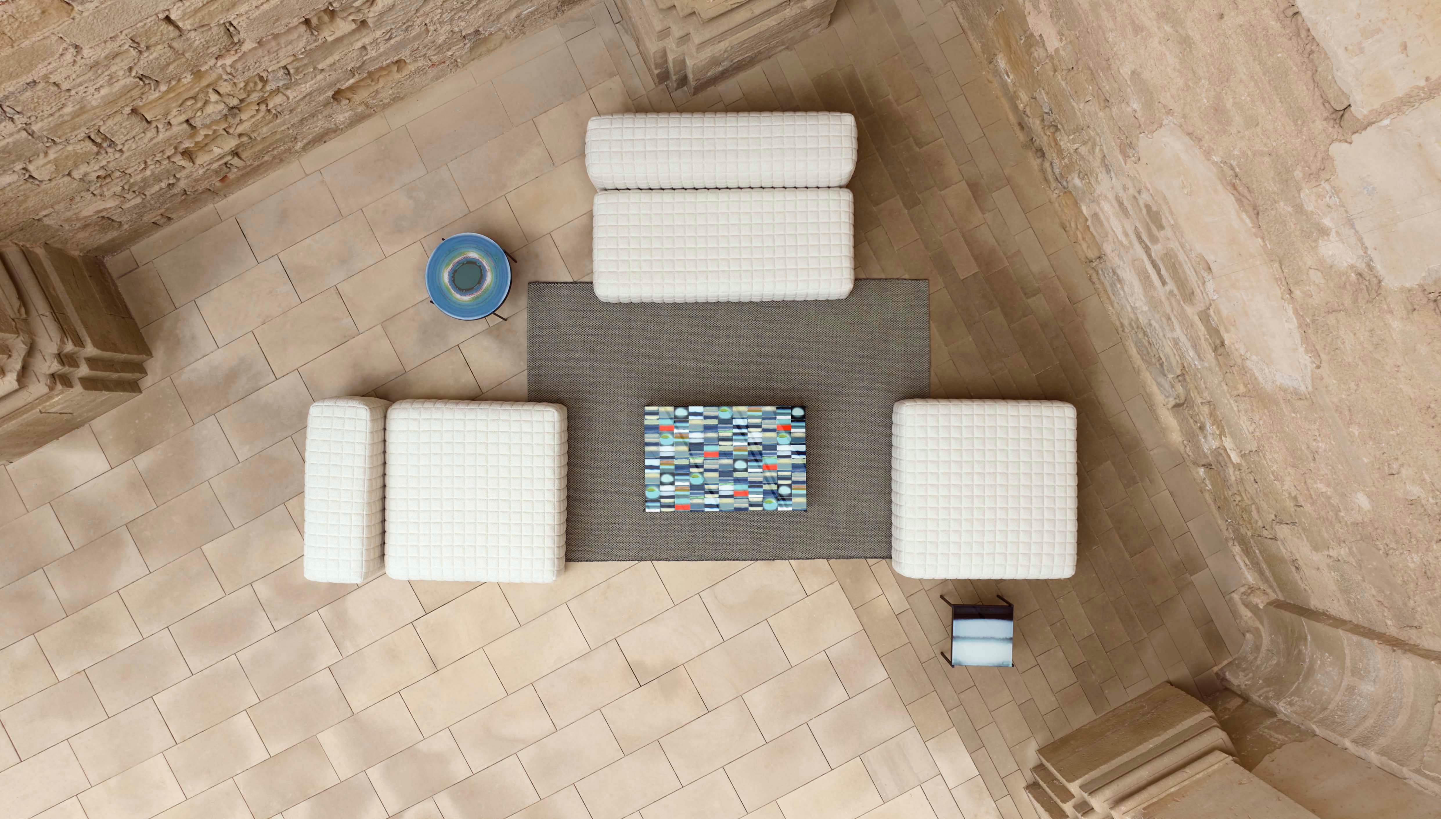 Die von Alejandra Gandía-Blasco für GANDIABLASCO entworfene Kollektion ERNO überträgt den formalen und spielerischen Geist des Rubik-Würfels auf die Welt der Außenmöbel. Die gepolsterten, modularen Hocker dieser Kollektion von Outdoor-Möbeln ermöglichen es, den Raum zu gestalten und laden je nach Konfiguration zum Sitzen, Liegen oder Faulenzen ein.
