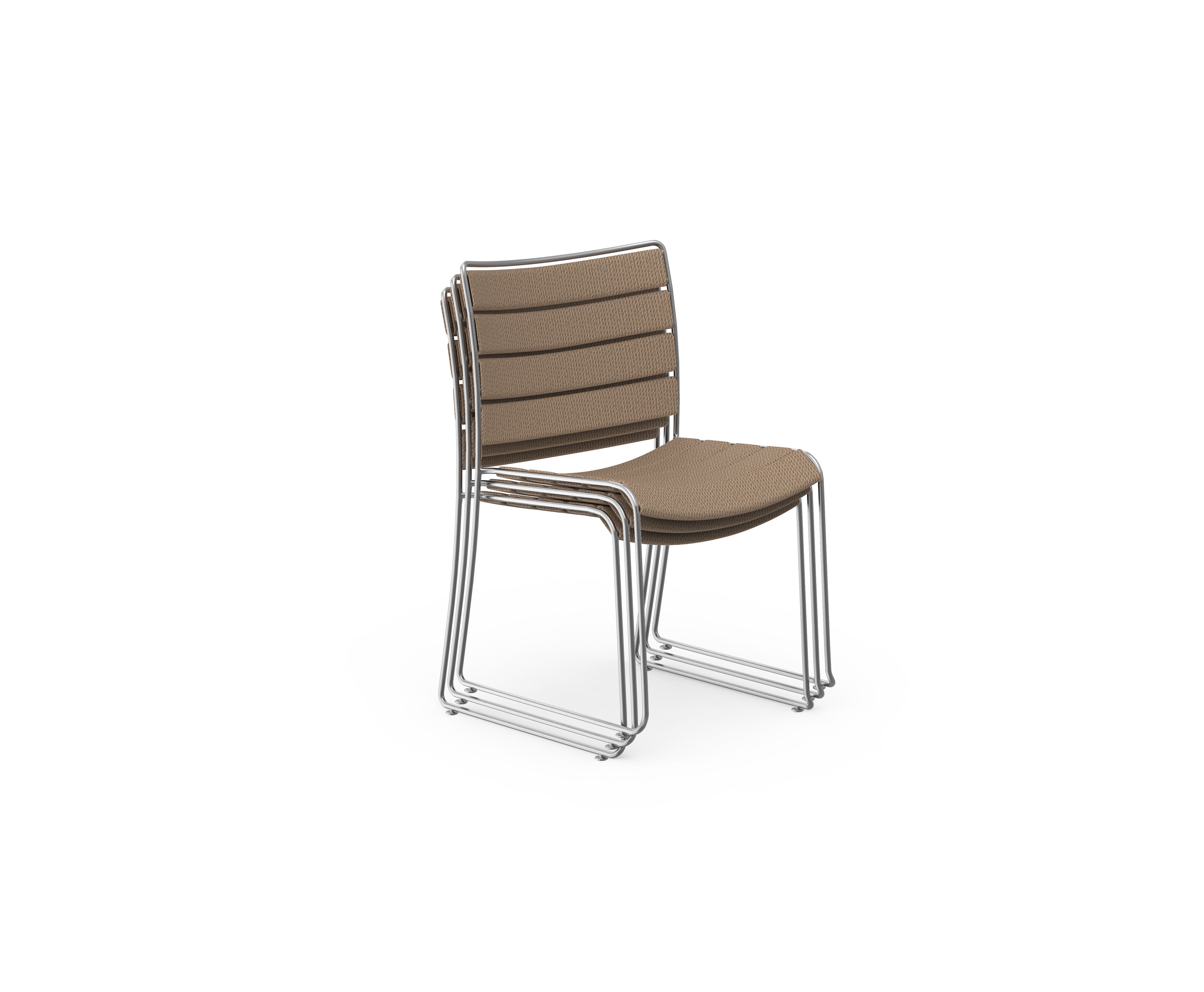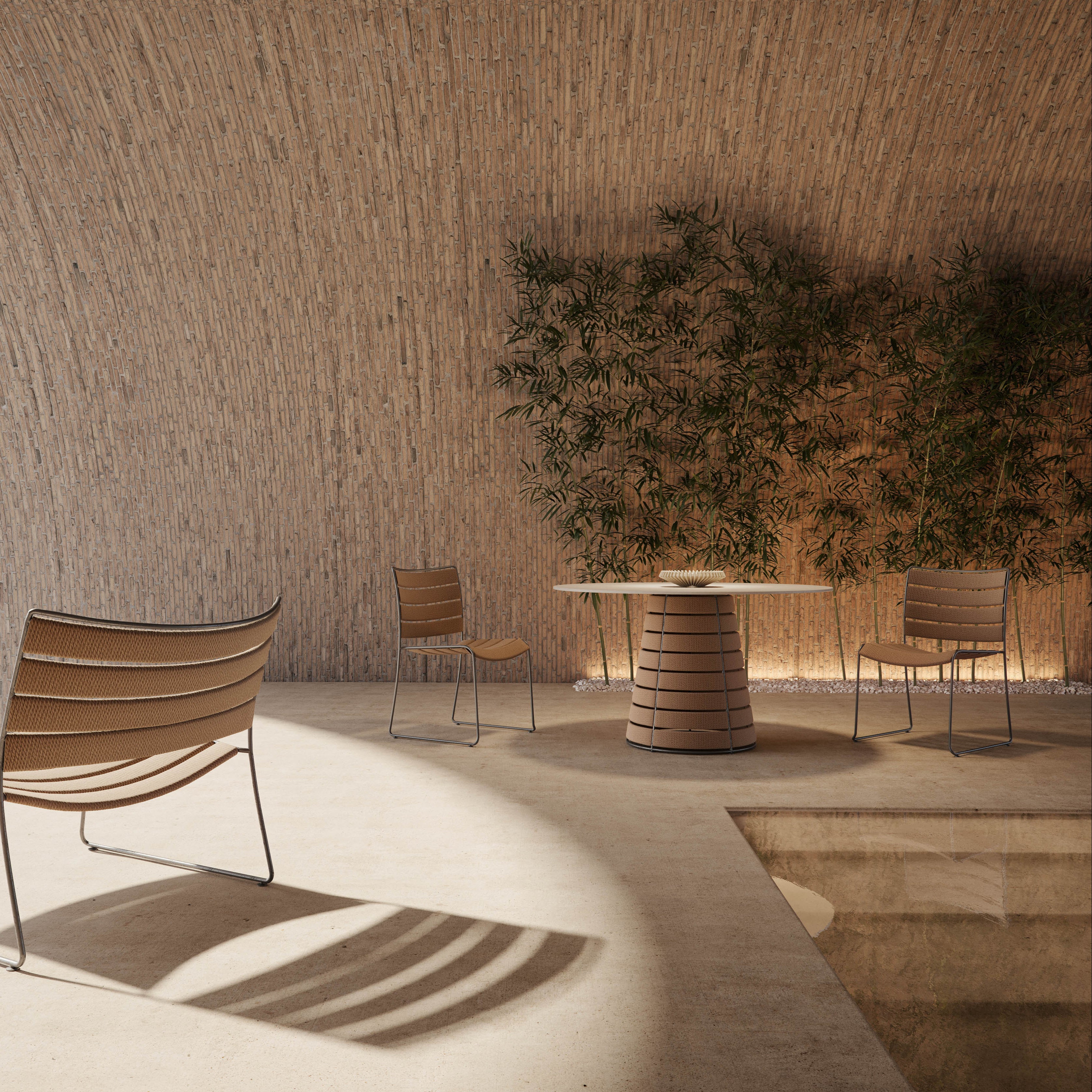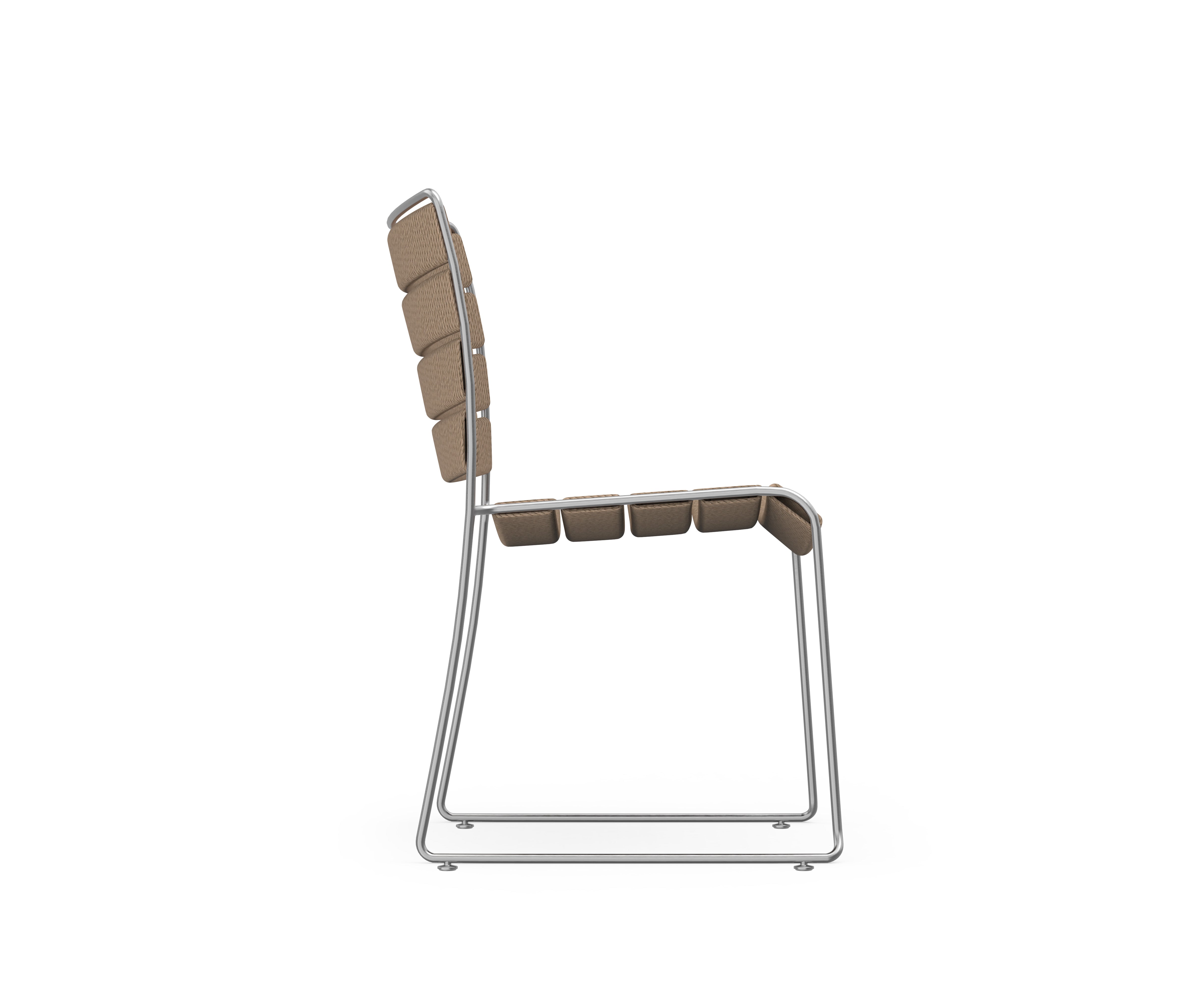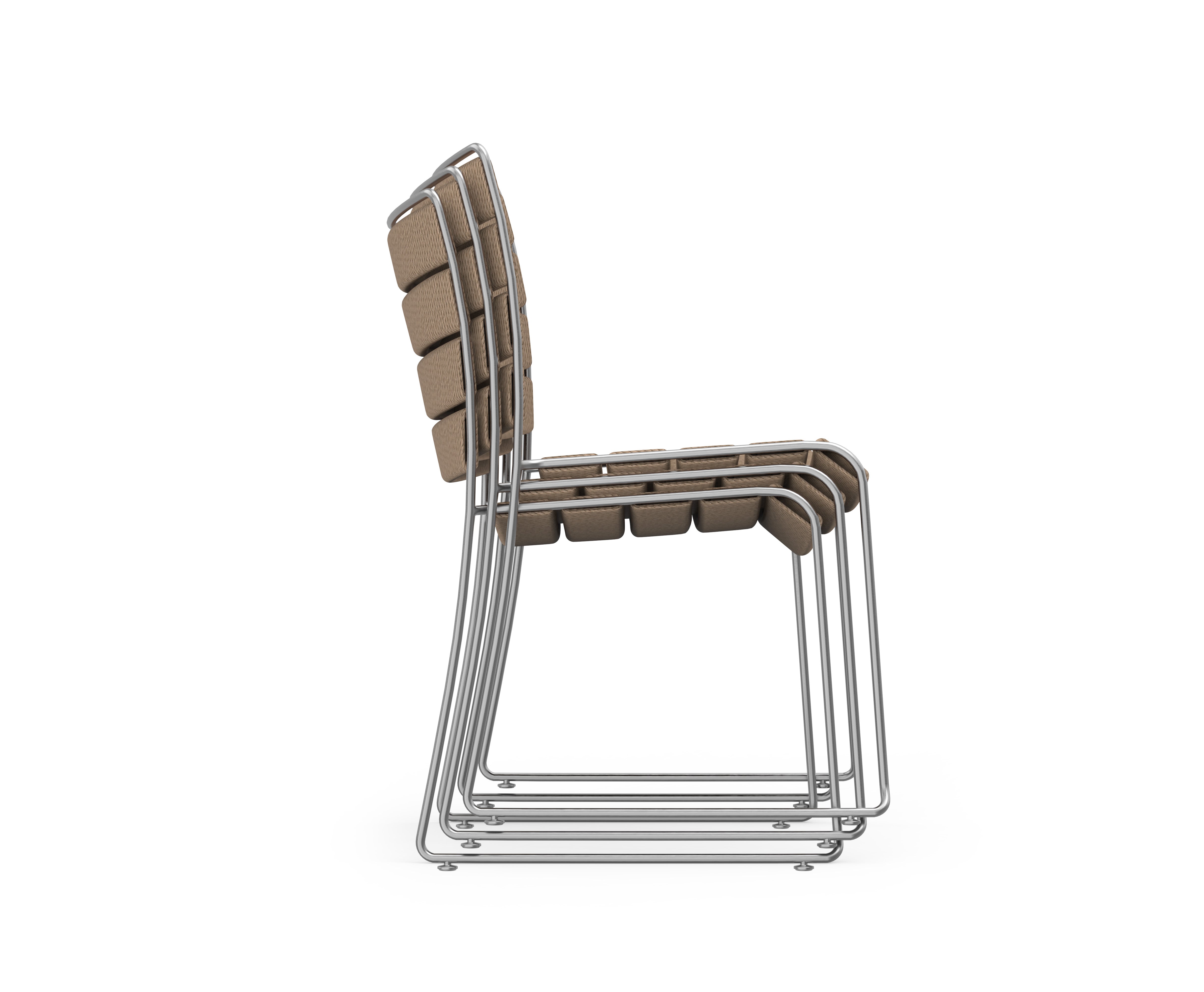 Die Tragkonstruktion besteht aus satiniertem Edelstahl AISI 316L. Sitzfläche und Rückenlehne sind aus Polyester-Seil gefertigt, einem widerstandsfähigen Material, das für den Außenbereich geeignet ist. Die Konstruktion bleibt mit einem 12 mm dünnen Rahmen absolut minimalistisch. Dieser Esszimmerstuhl ist stapelbar (maximal 4 Stück).