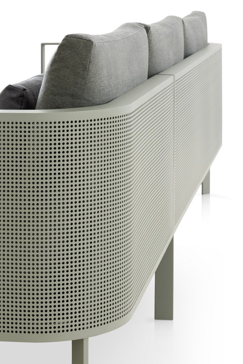 So besteht der SOLANAS Sektional 1 aus Aluminiumprofilen, die mit einem mikroperforierten Netz aus demselben Material verschweißt sind, sowie aus Dekton® von Cosentino, einem widerstandsfähigen Material, das in verschiedenen Ausführungen und Farben zur Auswahl steht. Die Kissen sind aus Polyurethanschaumgummi mit wasserabweisendem Stoff und abnehmbarer Sunbrella-Polsterung.