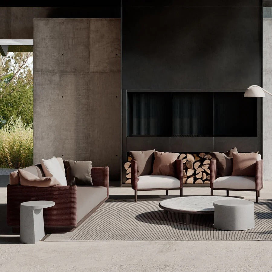 Giro ist eine Kollektion, die sich aufgrund ihrer Taktilität und reinen Linienführung in Innen- und Außenräume einfügt. Bei Giro gibt es eine gewisse Vielfalt an Formen, Texturen und Materialien (siehe den Unterschied zwischen den Sitzmöbeln und den Kaffee- und Beistelltischen). Und dennoch fügen sich alle Elemente harmonisch zusammen, um eine warme, taktile und angenehme Atmosphäre zu schaffen.