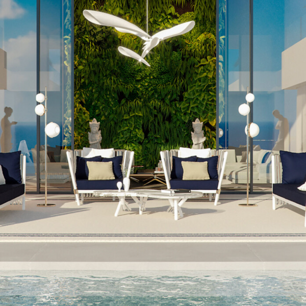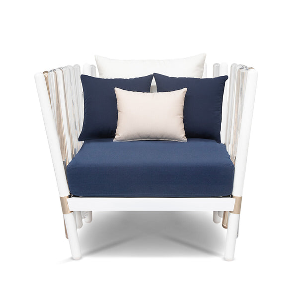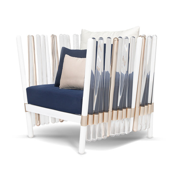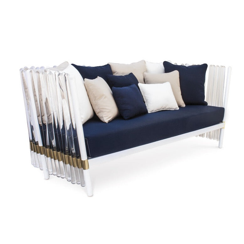 Die exklusive MYFACE LOUNGE HOUDINI ist eine einzigartige Komposition aus Licht und Schatten. Ein exklusives Gartensofa, der aus einem lackierten Aluminium-Gestellt besteht. Dieses wird mit klaren Acrylstäben durch mit Gold überzogenen Ringen vereint. Die Kissen sind im Preis inbegriffen.