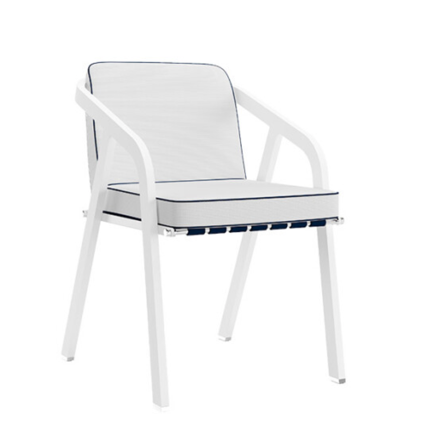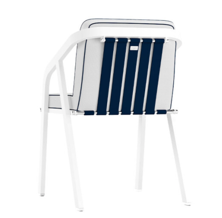 Hochresistente Stoffe auf den schlanken, elegant lackierten Aluminiumbeinen verleihen dem RIBBON Outdoor-Esszimmerstuhl den Komfort und die Raffinesse, die in jedem Essbereich benötigt werden.