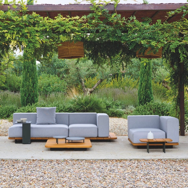 2 Sitzer Sofa Basis 184 x 92 aus Teakholz von Burma mit Beinen aus epoxylackiertem Aluminium Farbe Metallic Grey 56, Sitzkissen aus Schaumstoff von 35 kg. Mit undurchlässigem Innenbezug und Außenbezug mit Stoffen der Point Musterpalette. Sie können die Kissen auch ohne Stoff oder mit Ihrem eigenen Stoff kaufen.
