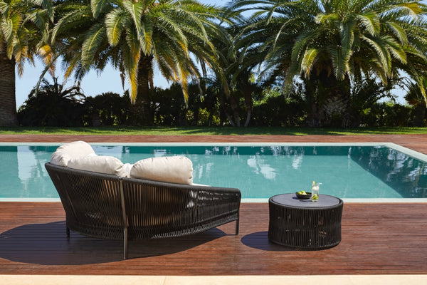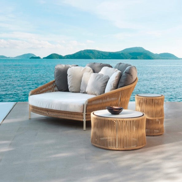 Runder Couchtisch Pulverbeschichtetes Aluminium, geflochten mit Polyesterseil. Tischplatte aus Porzellan oder HPL