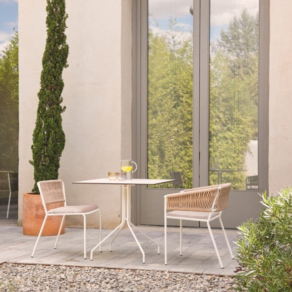 Stapelbarer Stuhl. Gestell aus pulverbeschichtetem Aluminium, umflochten mit Polyesterseilen in drei Ausführungen: Crema - Turrón (Nougatfarben) 61, Gris - Taupe 60 und Negro (Schwarz) 59. Sitzkissen aus 35 kg hochfestem Polyurethanschaum. Sie können die Kissen auch in weiteren Farben aus der Stoffpalette von Point, ohne Stoff oder mit Ihrem eigenen Stoff kaufen.