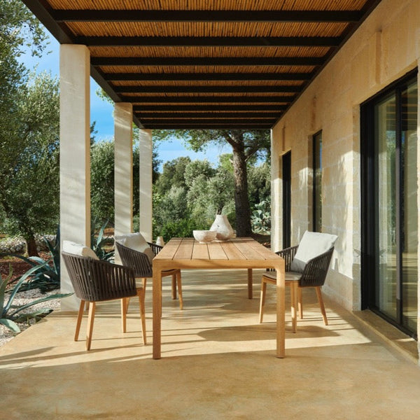 Die einfachsten, minimalistischen Designs sind manchmal auch die auffälligsten. Der Illum Tisch mit schlanken Beinen ist schlicht und einfach gehalten, mit schön abgerundeten Profilen als Detail. Bei dieser Version mit Teakholzrahmen sind die Ecken aus einem einzigen Stück handgeschliffen, was die natürliche Feinheit des Teakholzes noch verstärkt. Alle Fugen und Konturen sind schön abgerundet, was dem Illum Teakholztisch ein sanftes und warmes Aussehen verleiht. Bei der Tischplatte können Sie zwischen Teakholz oder Keramik in verschiedenen Farben wählen.