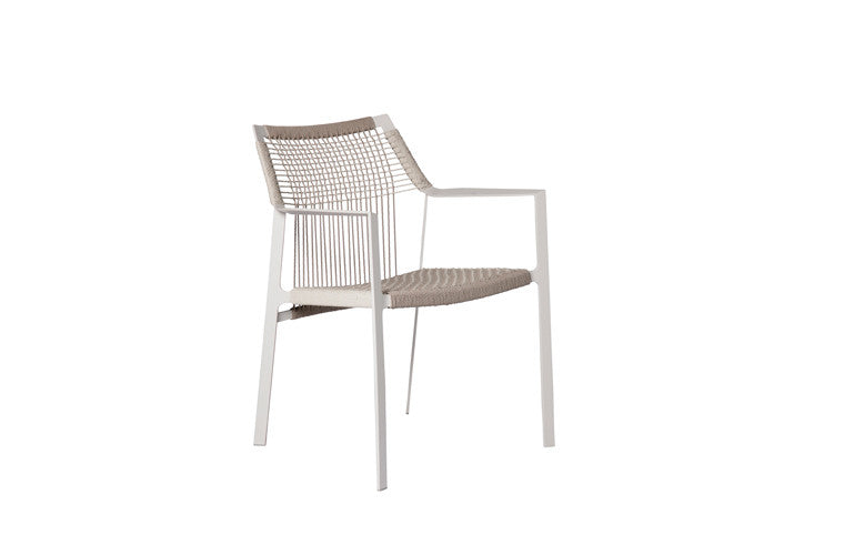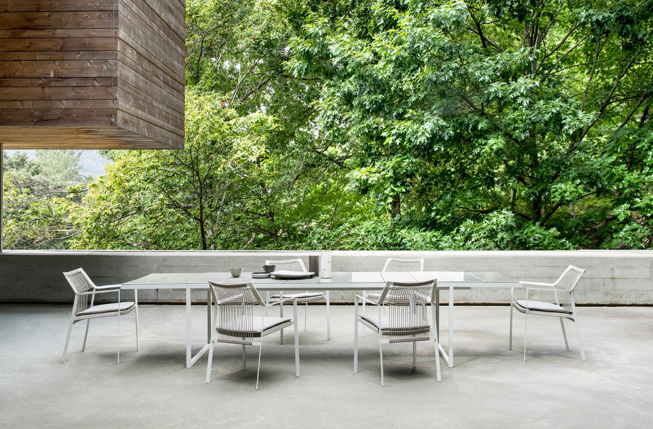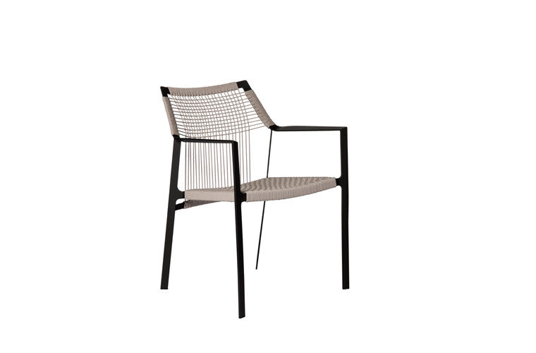 Die luftige Silhouette des Nodi Stuhls zeichnet sich durch gedrehtes Seil aus wetterfestem Canax® aus, das sich geometrisch über einen schlanken, skulpturalen Rahmen aus pulverbeschichtetem Edelstahl spannt. Raffinierte Proportionen und ein minimalistischer Umgang mit den Materialien verleihen der Kollektion eine zwanglose Leichtigkeit. Die schlanken Lehnen folgen den Konturen Ihres Arms in einer einladenden Geste. Das offene Geflecht aus Canax®, einer Kombination aus PVC und Naturhanf, ist vertikal und horizontal gekreuzt und verleiht dem Sitz und der Lehne Form und Struktur. Das geschmeidige Seilgitter gibt leicht nach für perfekten Sitzkomfort.