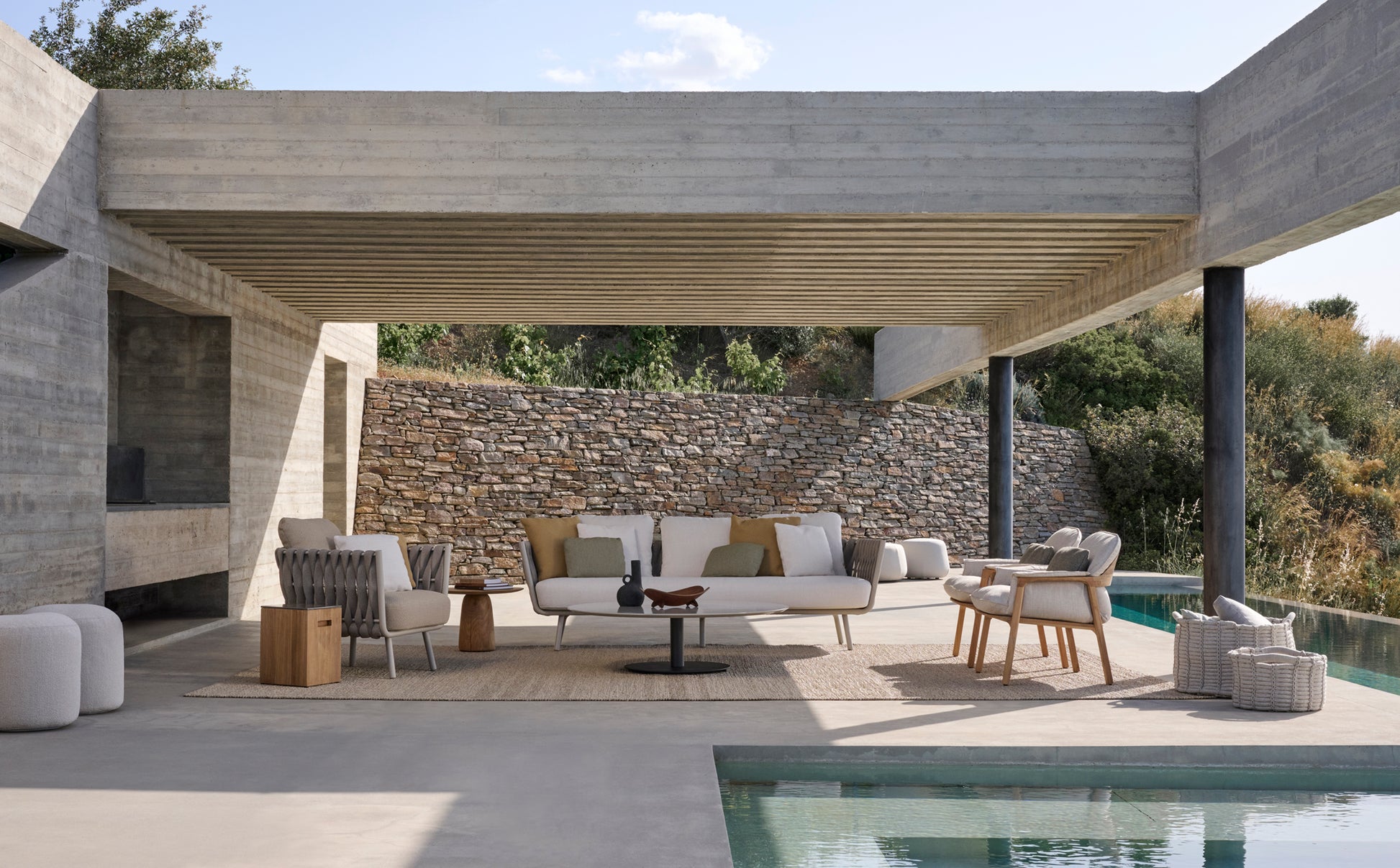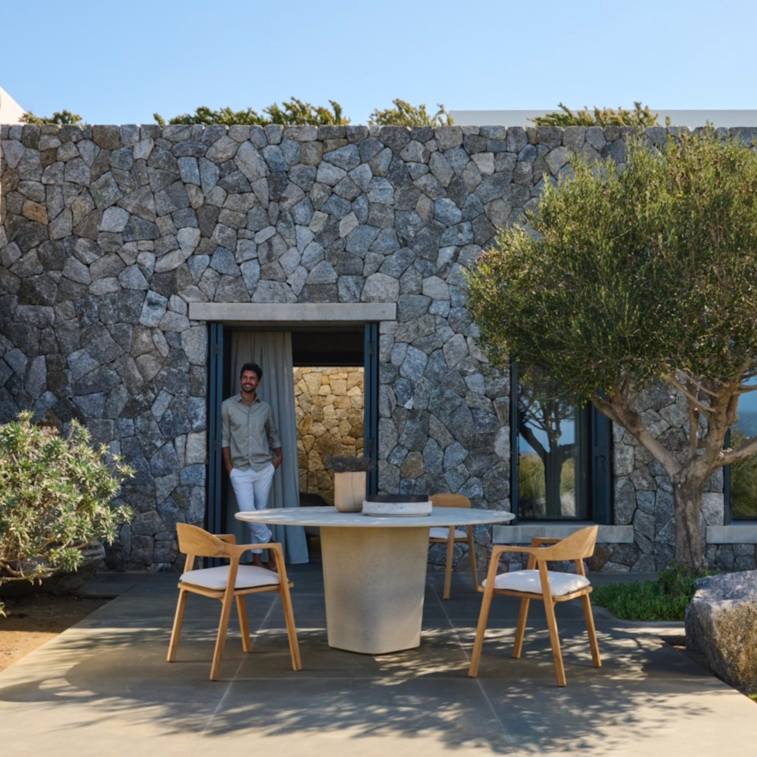Das tiefe Kissen des Nomad Stuhls ist so gestaltet, dass es Ihren Körper wie ein Kokon umhüllt. Es legt sich über die Armlehnen und geht in die breite Kurve der Rückenlehne über. Die Designerin Monica Armani verwendete Teakholz, weil dieses „edle Holz“, wie sie es nennt, so warm, glatt und stark ist. Die schlanken Beine und schlanken Armlehnen verleihen dem Stuhl ein elegantes Profil, und das fein gesteppte Kissen ist luxuriös und bequem zugleich. Wie der Name schon sagt, ist der Nomad Stuhl ein Stück, das überall verwendet werden kann, in Kombination mit einem Lounge-Arrangement oder als eigenständige Sitzgelegenheit.
