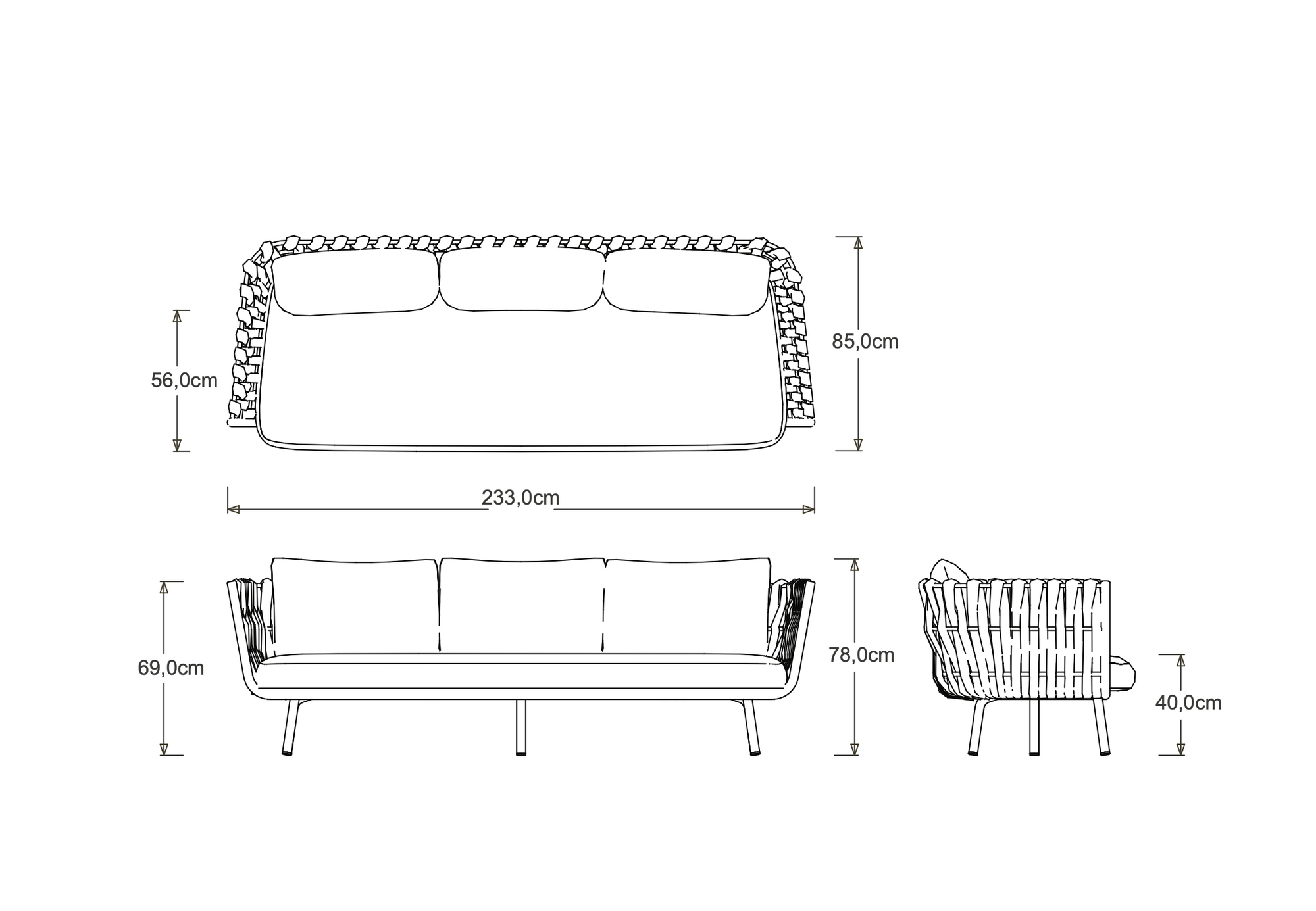 Die Tosca Kollektion ist zugleich warm und einladend, chic und faszinierend. Es war das erste Mal, dass TRIBÙ eine Designerin engagierte. Weiblichkeit und Emotion waren die Schlüsselwörter beim Entwurf dieser exklusiven Outdoormöbelkollektion. Eine elegante Sitzschale aus pulverbeschichtetem Edelstahl wird von schlanken, sich verjüngenden Beinen getragen und ist mit extra breitem, vertikalem Geflecht überzogen. Das Material für dieses Geflecht kann durchaus als innovativ bezeichnet werden: Schaumstoff wird mit einem schlauchförmigen „Strumpf“ überzogen, der aus Textilien und Polyolefin gestrickt ist. Das Material sieht überraschend natürlich aus, ist aber dennoch 100% wetterfest. Auch der Sitzkomfort des Sofas ist dank der bequemen Outdoorkissen sehr angenehm.