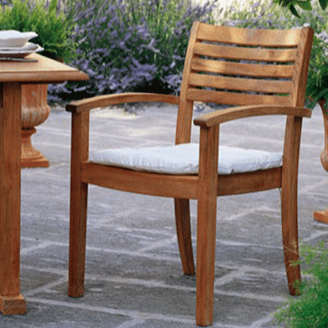 Der bequeme stapelbare Armstuhl Chelsea aus Teakholz fügt sich in jedes Ambiente ein. Mit seinem schlichten Design passt er bestens zu allen Teakholztischen und ist auch ohne Armlehnen erhältlich.