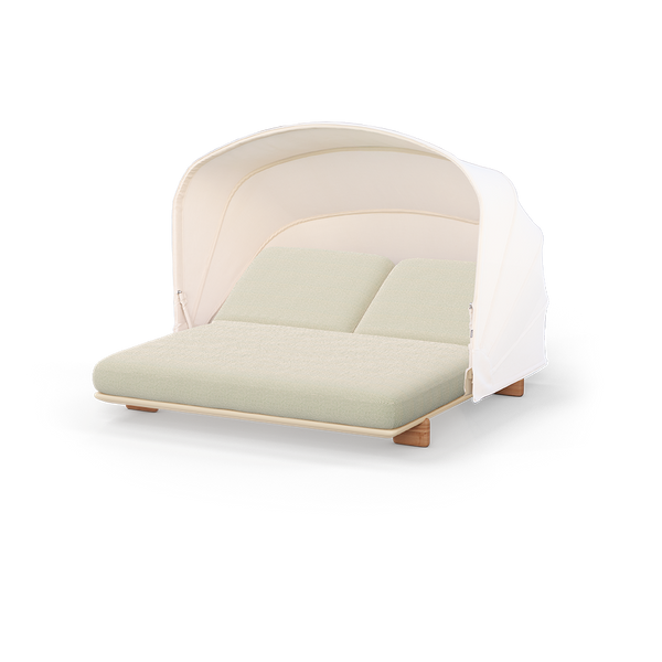 • Material: Aluminium, Iroko-Holz (Beine), Polyurethanschaum (Polster), PVC und Acrylgewebe für den Außenbereich (Sonnendach)