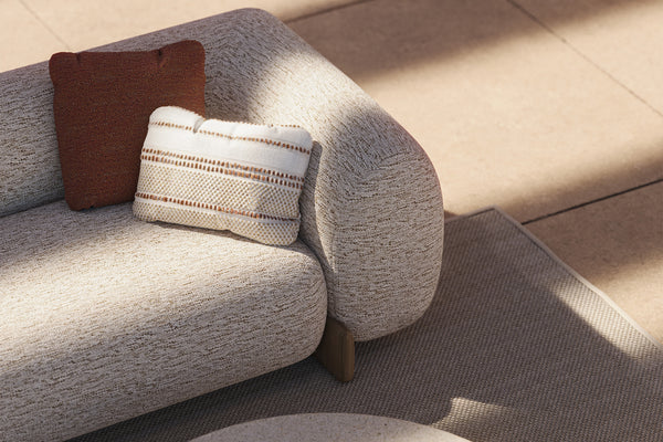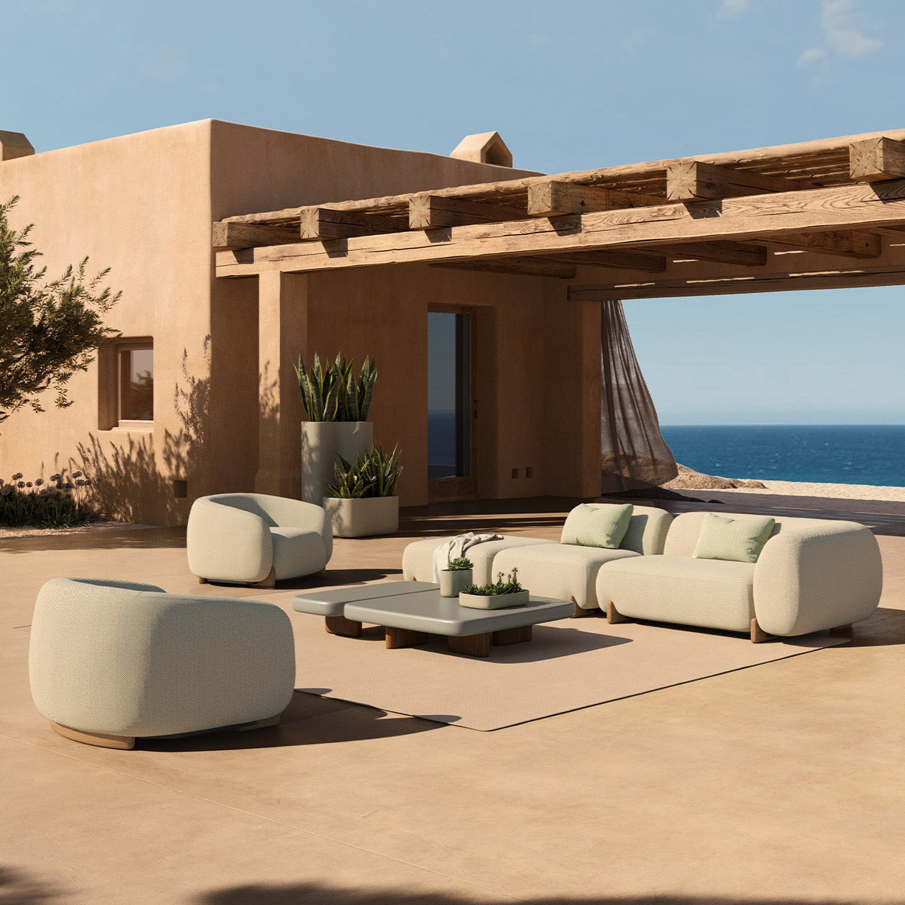 Dieses modulare Sofa kombiniert die Haltbarkeit von flexiblem Polyurethanschaum mit der natürlichen Schönheit von Iroko-Holz. Sein Design integriert hochwertige Lösungen und Materialien, die speziell für den Einsatz im Freien konzipiert wurden, ohne dabei auf Wärme und Komfort zu verzichten.